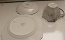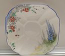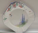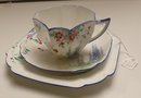 Beautiful Shelley Queen Anne Country Bell Deco Trio from 1929. It is bone china. The number is #11668. It is in excellent condition with no cracks or chips. The saucer measures 5 1/4" x 5 1/4" and the bread and butter plate is 6 1/2" x 6 1/2"