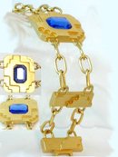 Made with layers of geometric design this wide rhinestone bracelet has a rich golden hue to it.It is 1 1/3" wide with a blue faceted center rhinestone. The sides bring it all together with the deco style links. This is 7 1/2" long and in great condition. Signed Monet.