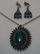 Simulated Turquoise Pendant & Earrings. This is a lovely piece of simulated turquoise set in silver tone with matching clip earrings. These are nice pieces of costume jewelry. The pendant has a center piece in medium to dark blue with black lines. It measures 5/8" across and 1" long. Around that stone is a circle of lighter colored blue round stones about 1/8" circles and around those are small silver tone beads. Then the outer edge has a row of slender blue simulated stones that match the center stone. The extreme outer points each have a silver tone ball. It measures 2" by 2 1/2" It is on e 24" curb silver tone chain. The Matching stones are clip, dangle.