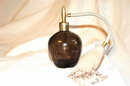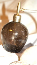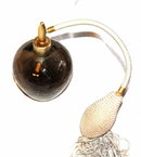 Lovely Old perfume bottle of smokey quartz colored crackle glass. The fabric covered atomizer is gray and it has tassels. The bladder of the atomizer is still very supple. The whole piece is 4 3/4" tall. The condition is very good for an old item like this.