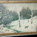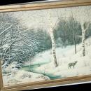 Snowy Birch Forest with Fawn Painting AA Augusts or Augustso 1930 / Framed Lithograph