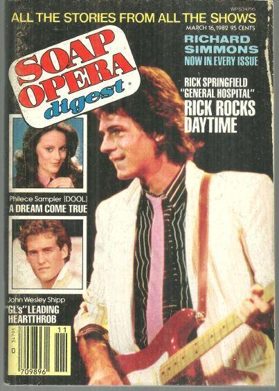 Soap Opera Digest March 16, 1982. Rick Springfield on the Cover. Articles inside include Richard Simmons, Doctors Celebrates, Rick Springfield, John Wesley Shipp, Philece Sampler, Carol Burnett, and more. Filled with Photographs of your favorite Soap stars and vintage advertising. Magazine is in good condition, wear and creases at edges.