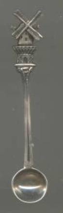 A wonderful addition to anyones collection of souvenir salt spoons. A very nicely made windmill sits atop this spoon. The padals on the windmill do turn, although not real freely. There is a lot of detail on the windmill. The marks on the back:835 in an oval cartouche//another cartouche with HH and what appears to be an arrow going through the center from right to left(but is very hard to br sure about the arrow)//and the sword sterling mark for Nederland W/835 "ON" the blade(they began to put this on the blade in 1953). There are a few minor surface scratches on the back. There are a couple of tiny spots on the finish on the back. I only cleaned the marks real well, so these may clean off as well. I did not want to take all the patina off of the windmill. It measures aprox. 2 3/4"X1/2". The shipping fees quoted are for priority/No insurance in USA only.