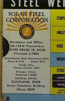 This is a nice clean slide calculator, marked "STEEL WEIGHT CALCULATOR FOR SMALL SIZES AND STRUCTURAL SHAPES SOLAR STEEL CORP. RIVER ROUGE 18 MICH.". It is double sided with "STRIPS AND SHEETS, ANGLES, BARS, WEIGHTS, STRUCTURAL SHAPES" sizes and weights on one side, and "STEEL WEIGHT CALCULATOR FOR LARGE SIZES AND CIRCLES" on the other, including "PLATES, ANGLES, BARS, CIRCLES". The calculator is made of a coated paper card, one inner slide card and one doubled outside card, and is in very good condition overall, with little wear, the inner card slides smoothly, and the variable numbers/text align well in the windows, a little minor edge wear, and all the text is easy to see and read. It is rare, and is marked with a copyright date of 1947. Quite nice!
