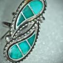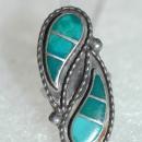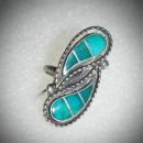 One of a kind Hand Crafted South Western Native American Sterling & Turquoise Ying Yang style Ring. Or it could be consider a nestling twin water drops. In any event is is hand crafted Native American piece that has an etched signature on the back. Each curved tear drop has 3 channeled sections that that feature 3 progressive shades of authentic turquoise stones from blue to a greenish shade of stone. The size is 5.25. The face of the ring is 1.5 inches and .5 inch wide and 7.2 grams