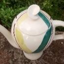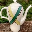 "Highlander" (green) pattern coffee pot, made by Stetson in the 1950s on the "Rio" shape. Loose-woven plaid. Measures 11"h. Has one 1" hairline crack to rim as shown, and a tiny chip from the tip of the spout. Sold as is. Hard to find piece in this pattern. Inglenook Antiques...Established 1989.