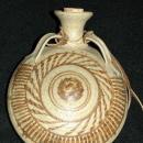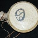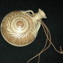 Stoneware Canteen or Flask on Leather strap Art Pottery Signed . It is unglazed round hip flask with spout,, handle and a nice design. It also has the cork. It measures 6.5 across and 7.5" up and down including the spout.