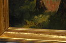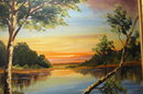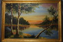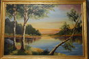 Lovely vintage framed oil painting of a sunset on a lake framed by birch trees. It is sign by V. Bjork. It is an oil on board. The condition is very good.
