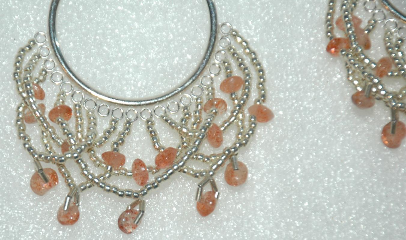 Or Best OfferStunning Sunstone Sun Stone & Sterling Silver Swag Hoop Earrings, Hand Crafted One of a Kind . These are hand crafted and designed by myself using a solid sterling silver hoop earring with loops. They are embellished with swags of tiny silver coated glass beads, sterling silver liquid silver beads from an old Navajo necklace and small disc shape authentic Sunstone beads.