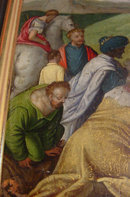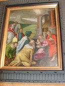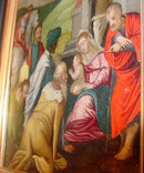 This highly detailed painting of the Holy Family being visited by the Magi and others is rendered in oil on copper. Delicately applied gold details enliven the colorful costumes. Approximately 6-1/2 inches by 5-3/8 inches, Flanders, Seventeenth Century. Please note that the painting has recently been re-framed more appropriately.