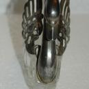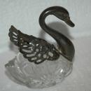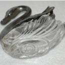Swan Figure Open Salt or Salt Cellars Glass with Silver Wings Signed Italy .. Elegant elongated swan necks and beaks. Silver plate is signed Italy. Glass bodies with feathers, scalloped and fluted from glass. It is are 3.5" tall with 3" length. The wings are of open work and hinged to moved up or down for salt cellar access. No chips or cracks
