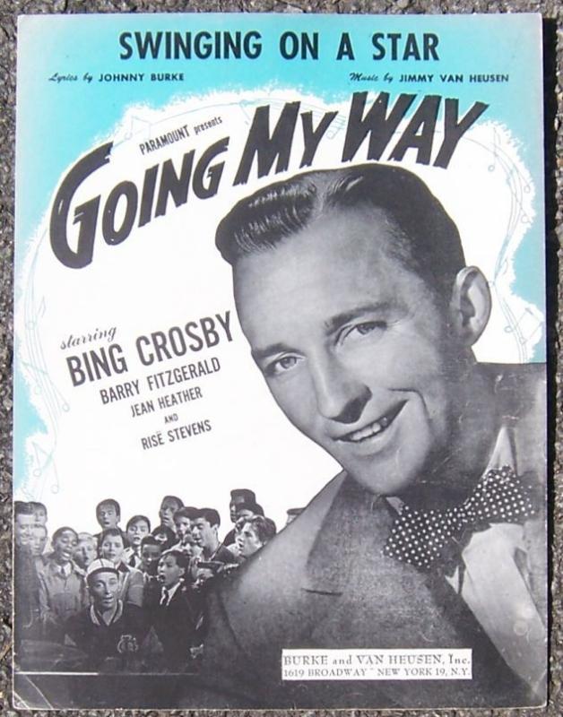 Swinging on a Star Sung by Bing Crosby in the Paramount Picture Going My Way. Also starring Barry Fitzgerald, Jean Heather and Rise Stevens. Lyrics by Johnny Burke and Music by Jimmy Van Heusen. Sheet Music is in good condition, wear at edges, previous owner's name on front cover. 1944 Burke and Van Heusen.