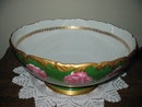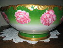 HERE IS A LARGE AND BEAUTIFULLY HAND PAINTED STUDIO DECORATED T & V LIMOGES PUNCHBOWL FROM THE TURN OF THE CENTURY IN GREAT CONDITION. IT FEATURES HIGHLY DETAILED BRIGHT PINK ROSES ALL AROUND ON A GREEN BACKGROUND. THERE IS LAVISH GOLD GILDING AROUND THE TOP, INSIDE AND AROUND THE BASE WITH VIRTUALLY NO WEAR AT ALL. IT MEASURES 14" IN DIAMETER AND 6.5" HIGH. NO CHIPS CRACKS HAIRLINES OR REPAIRS. TRESSEMANN & VOGT MARK 5a IN GREEN UNDERGLAZE AND DECORATING MARK 11 IN RED OVERGLAZE.