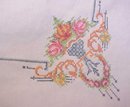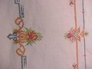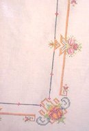 This is a very nice, fancy cross stitch embroidered card table size table topper with very fancy and colorful embroidery. It is about 32" square, and in very good condition, no stains, no holes, no rips. The embroidery appears to be done by machine, but very nice work!