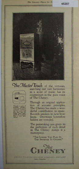 The Cheney Record Player 1920 Ad. This black and white February 21, 1920 Cheney Talking Machine Co. ad states The Master Touch of the Virtuoso, searching out rare harmonies in a score of music, has its counterpart in pure voice of The Cheney. Picture shows The Cheney Talking Machine. Magazine tear sheet picture is taken through plastic and may show wrinkles or crookedness that is not in the ad. This original magazine tear sheet measures 5 1/4 inches wide by 11 3/4 inches tall.