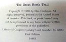 This is a very interesting about the trails of the ages from Asia, across Alaska, down to the Rocky Mountains! "THE GREAT NORTH TRAIL" by DAN CUSHMAN. Copyright 1966 First Edition. It is a hardback with a dust cover. The book is in very good condition, the dust cover good+ condition with some curles, creases, and one repaired tear on the bottom front. This book is 384 very clean pages, no damage, a past owner's name and date in the front blank inside page, in ink. It measures 6.25" x 9.25".
