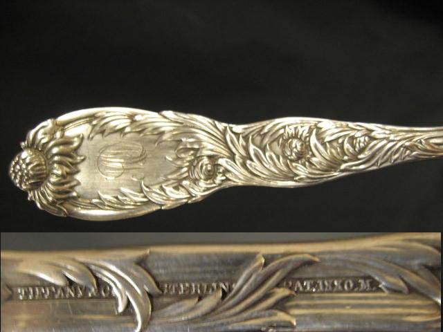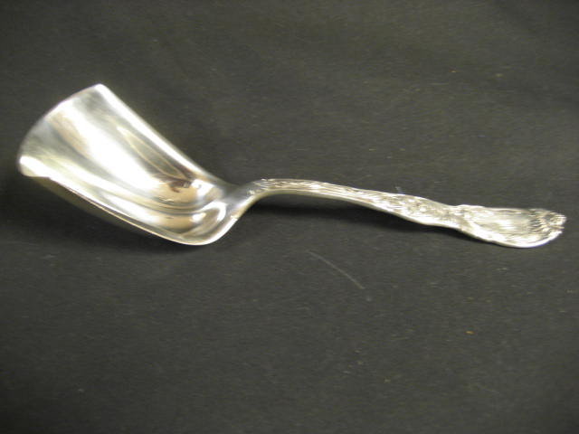 Tiffany & Co. Chrysanthemum sterling silver large serving piece circa 1880. This Tiffany serving piece measures approx. 9" and is in fine original condition with no signs of restoration. Has been recently polished. The Chrysanthemum pattern is a beautiful and highly desirable Tiffany & Co sterling silver pattern. Impressed on back of the handle with markings: Tiffany & Co. / Sterling / Pat.1880.M. There is a faint monogram on the front handle of what appears to be an: "H".