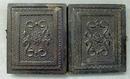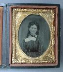 Offering this lovely old tintype of a yound Civil War Era lady in a striped dress & blush on her cheeks. Set in an ornate gold metal framing, protective glass covering. Other side has raised detailed velvet padding. Outside of case has raised detailed designs front and back. Original taped hinging. Brass hook closure. Good condition, no cracks or chips. One spot on back top side. Hinges and clasp are very good. A wonderful addition to your collection!