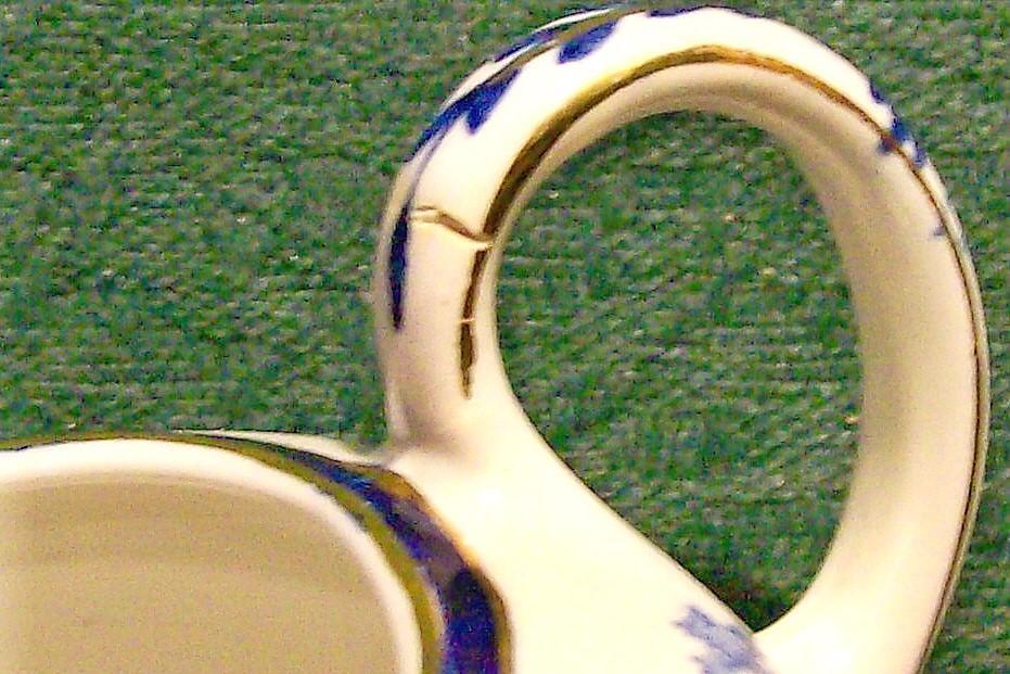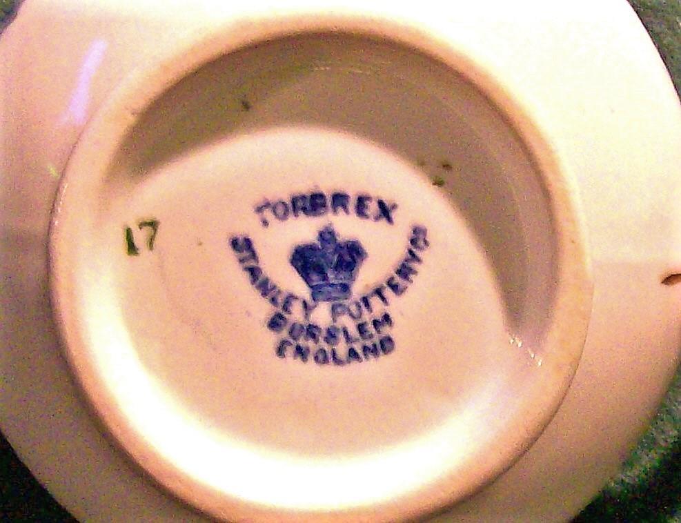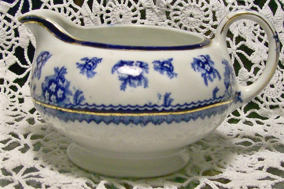 Creamer in the "Torbrex" pattern, made by Stanley Potteries of England. Circa 1907. Blue & white pattern with hand-painted gold trim. Measures 3.25"h, 4"d. Has a break in the handle that has been partially repaired long ago. Sold as is. Inglenook Antiques...Established 1989.