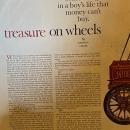 Treasure On Wheels 1961 Article. This 4 page Color July 8, 1961 article by Prentiss Combs states there are some things in a boys life that money cant buy. Treasure on Wheels. Picture by Don Almquist shows The Empress a Restored Red Car with Gold top. Boy is holding rear wheel and man is looking at car. Magazine tear sheet picture is taken through plastic and may show wrinkles or crookedness that is not in the ad. This original magazine tear sheet measures 10 1/4 inches wide by 13 1/4 inches tall.
