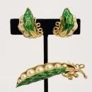 This wonderful brooch and clip earrings set is of a green enameled pod with faux pearl peas. It was designed by Alfred Philippe for Trifari in 1966. All pieces have the Trifari signature with the crown T symbol, and all pieces are in excellent condition.