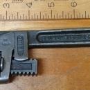 This is a very nice, antique 10" long adjustable pipe wrench, marked "TRIMO TRIMONT MFG. CO. ROXBURY MASS. U.S.A. TRIMO SIZE 10" DROP FORGED" on the handle area, and "PAT'D 6-20-16" on the spring loaded carriage near the knurl. In good++ condition with very minimal wear, no rust, good straight metal and gears. The teeth sharpness is very good. It appears to have been a very carfully used wrench, very few dings, and those are only minor. The knurled thumbwheel design works great as it incorporates a pair of stamped steel U shaped washers, (formed to fit into the knurl wheel for smoother operation) that helps the thumb wheel turn much easier, and also protects the knurl nut and guides the moving jaw better) than those without this feature. The two knurl guides or washers are also marked "PAT'D" on them both. The washer is formed to fit into the knurl wheel, so the guides do not spin like a washer would, but remain stationary. A very nicely designed hard to find size, nice clean wrench, from the early 1920's era. Measures 9.6" long (completely closed) even though it is marked 10"on the wrench, and the jaws are .7" thick. A very nice collectible patented wrench overall!