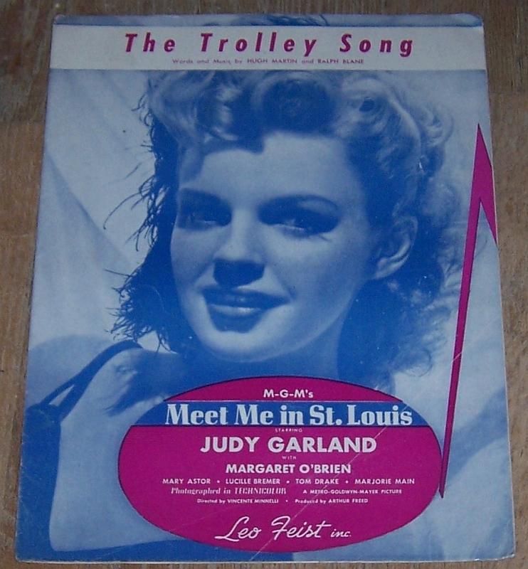 Trolley Song From the MGM. Picture Meet Me in St. Louis, starring Judy Garland with Margaret O'Brien, Mary Astor, Lucille Bremer, Marjorie Main, and Tom Drake. Words by Andrew Sterling and Music by Kerry Mills. Directed by Vincente Minnelli. Sheet music is in good condition, wear at edges, previous owner's name and music store stamp on front cover. Leo Feist New York 1944