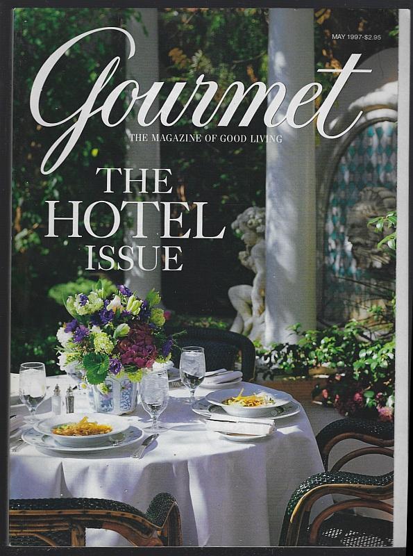 Gourmet Magazine May 1997. The Hotel Issue. Hotel Bel-Air on Cover. Articles inside include Puerto Rico, The Hawaiian Islands, Hong Kong, Sydney, Paris, London, European Idylls, Chef's Salads, Spa Fare and more. Filled with great illustrations and advertising. Magazine is in good condition, wear at edges