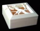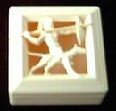 A very attractive dressing table box for the man in your life. It has a wonderful cut out decoration on the top, of a walking or running Roman soldier,preparing to throw a spear with a large dog at his side. It is a nice warm, creamy ivory color plastic. It has a molded makers mark in the bottom. It is from Hickock. It may well have been a presentation box for a set of mens cuff links and tie clip. The box is aprox. 3 3/4" square and 1 3/4" high. It is in excellent condition. There are a couple of dark spots on the bottom. I did not try real hard to get it off, did not want to damage the plastic. Does not detract, only seen if you pick it up and turn it over.