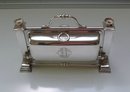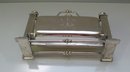 Unusual Victorian silver plate biscuit box that is sleek and small. It is in excellent condition. The base measures 8" x 2 3/4" x 5 1/2" high. Special for collectors or for a small buffet or table