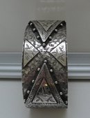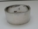 Wonderful Victorian Sterling Silver Bangle in very good condition. It is a very strong Victorian design that measures 1 1/4" wide and the inner diameter is 2 3/8" x 1 7/8". The design has a midieval feel to it and it is a weighty piece. Great powerful look. It weighs 45 grams.