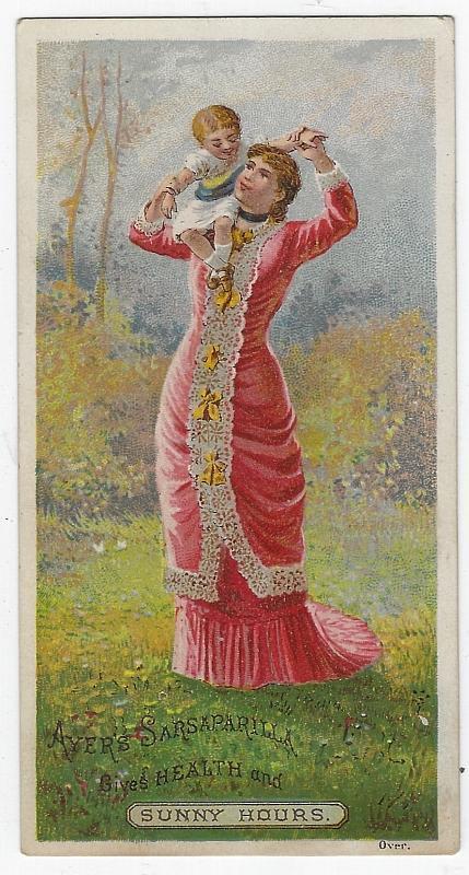 Victorian Trade Card for Ayer's Sarsaparilla for Purifying the Blood. Health and Happiness. Front of Card has Mother and Baby Playing, Sunny Hours. Back of card has information about all the cures. Card is 2 3/4 across and 5 1/4" high. Card is in good condition, wear at edges.