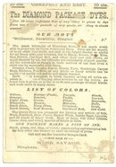 Victorian Trade Card for Diamond Dyes. Front of the card has School Children Boasting the Features of Diamond Dyes. Back of the card has information. Card is 5" across and 3 1/2" high. Card is in good condition, slight wear at edges, wear, surface tears and glue stains on back, creases in corners.