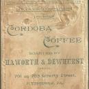 Victorian Trade Card Compliments of Haworth and Dewhurst Manufactures of Cordoba Coffee. Front has Lovely Lady with Flowers. Back has information. Card is 5 1/2" high and 3 1/2" across. Good condition, wear at edges, yellowing on back.