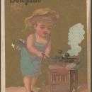 Victorian Trade Card for Soapine. On the Front of the card is Little Boy Roasting Chestnuts, Novembre. Back of card has information about Soapine. Kendall Mfg. Co. Providence, Rhode Island. Card is 4 1/4" high and 3" across. Card is in good condition, wear at edges, glue stains on back.