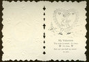 Victorian Valentine with Dancing Girl in Blue Dress. Inside is girl with Valentine. My Valentine. The rose is sweet, it's true, it's true. But not one-half as sweet as you. Valentine is 3 3/4" high and 2 1/2" across. Whitney Made. Valentine is in good condition, names are written on back, wear at edges.