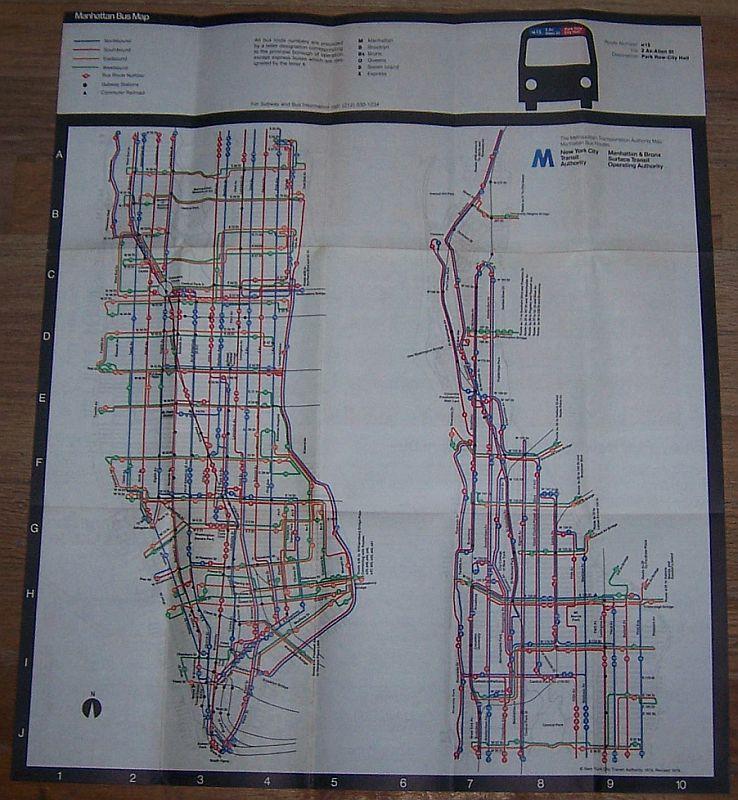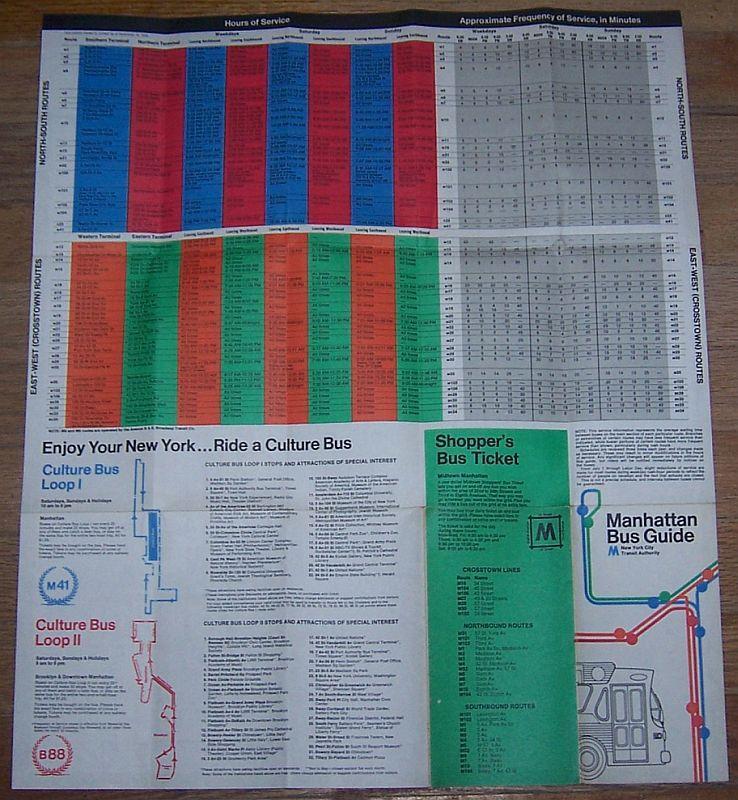 New York City Transit Authority. Double sided. Bus Map, Hours, Culture Bus, Shoppers Bus Ticket and more. Good condition, wear at edges, creases from folding, light soiling.