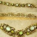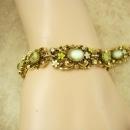 Beautiful pale green faux moonstones create the center pieces for these rich adorned panels on this signed ART Bracelet. Tiny Sparkles of rhinestones with tiny enamel flowers are the most beautiful accents for this gorgeous bracelet. The bracelet measures 7" long when closed and a little over 1/2" wide. It is in great shape. VintageSparkles offers Layaway on all our pieces regardless of which site it comes from.All layaway payments will need to be in the form of a check or money order only. Please remember that vintage & antique items are not mint, nor are they perfect but they sure are full of old history and charm. Please use photos to make your decisions and read our policies prior to buying so you can have an excellent experience with us. Please use this number when ordering gaa445040. If you want to see more of these pretties this is the link to my etsy store. http://www.vintagesparkles.etsy.com/ or visit our gallery on pinterest where you can see all our pieces at once http://pinterest.com/etsyvsparkles/sparkles-in-my-etsy-store/