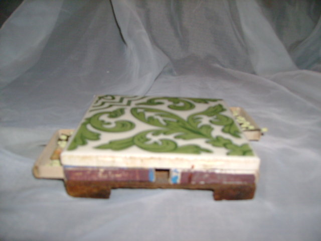 Vintage match holder that holds 4 boxes of matches. Beautiful ceramic tile on with a colorful 2 tone green design. The base is wooden and it has 4 wooden feet. Each match box is full of original thin little matches and one box is still sealed. The holder is 4 1/4" square.