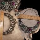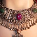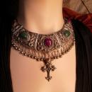 Cleopatra would be proud to wear a collar necklace like this. Her favorite creatures, (serpents and snakes) surround three large jeweled cabachons that are ruby color and jade color. Set in a wide ( 2" with an additional 2" drop for the cross) hinged european collar with many drops that hang from it. A large signed ( can't make it out) gothic cross with a glass venetian bead that is sterling ( the necklace is not sterling, just the bead). The necklace measures 19" long on the inside. It is a very impressive old piece for sure!