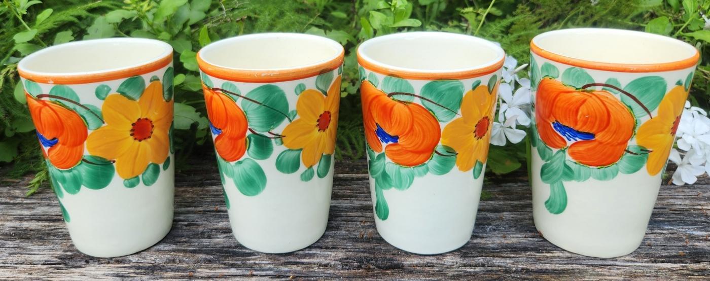 Czechoslovakian pottery matching tumbler set of 4. Hand-painted flowers in blue, orange, green and black on a cream background with orange line trim. Impressed mark #10487, likely made by Peasant Art Industries, circa 1920s. Measure 4 1/8"h x 3"d at rim. No large chips or cracks, only some minor rim abrasions. Sold as is, and as a set. Inglenook Antiques...Established 1989.