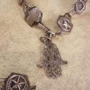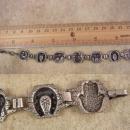 The hamsa (khamsah, also romanized khamsa, meaning lit. "five" or Hand of Fatima, Hand of Venus ) is a palm-shaped amulet popular throughout the Middle East and North Africa, and commonly used in jewelry and wall hangings. A universal sign of protection, the image of the open right hand is seen in Mesopotamian artifacts in the amulets of the Qāt Ištar and the Qāt Inana and in the Buddha's gesture (mudrā) of teaching and protection. The Hand-of-Mary that was used to protect women from the evil eye, boost fertility and lactation, promote healthy pregnancies, and strengthen the weak. The bracelet measures from 6 1/4" to 7" depending on where you hook it. I am not sure of silver content.