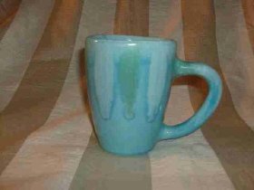 This vintage pottery mug by Dryden is the most beautiful color of aqua. The alternating dripped design in lighter & darker aqua are outstanding. Dryden is hand written on the bottom. It's 4 " tall.