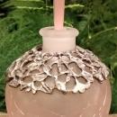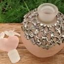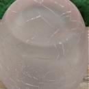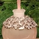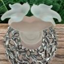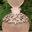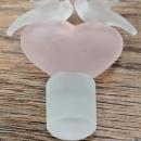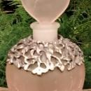 Frosted pink crackle glass perfume bottle with heart-shaped ground stopper topped by 2 frosted birds. Bottle has a molded floral pewter collar wrapped around it. Dates from the 1970s-80s. Measures 5"h overall. Nice condition, with no chips or cracks. Inglenook Antiques...Established 1989.