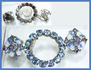 Givre glass stones have a mix of colors ( usually 2) and this blue has stones in a color I have never seen in Givre glass. The blue is a really soft sky blue and in the brooch and the earrings have an added hint of periwinkle with these bright pink aurora borealis accents. The brooch is 1 7/8 across and has prong set stones in a heavy silver metal setting. The earrings are 1 across and clip on and even prettier than the photos!