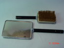 The backs of this vintage art deco style hair brush and hand mirror are sea foam green plastic. There is haziness in the mirror but not spots. The bristles of the hair brush are made of straw and are in very good condition.