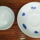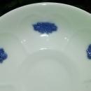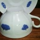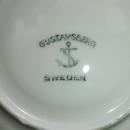 "Bla Blom" flat cup & saucer, made by Gustavsberg/Gustafsberg of Sweden. White porcelain with applied blue grape clusters. Discontinued pattern. Anchor mark, dates from around 1932+. Cup measures 2 1/8"h x 3.5"d, saucer 6"d. Very nice condition with no chips or cracks. Inglenook Antiques...Established 1989.