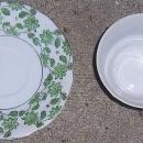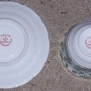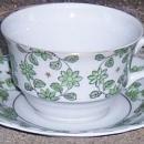 Hadson Chinaware Cup and Saucer. Made in Occupied Japan. Cup and Saucer have Green Flowers, Gold Stars and Gold trim at edges. Cup is 2" High and 3 1/2" Across. Saucer is 5 1/2" Across. Good condition. Gold trim at edges does have some wear.