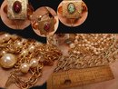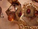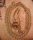 I have never seen a large fob like this with a hidden compartment that is spring loaded. You pull on the pointed metal pointed adornment and inside there is a portrait under glass of a renaissance queen?. Four sides are jeweled with glass and or faux semi precious stones. This huge fob hangs from hand knotted ivory glass pearls and a golden chain. Add to that this separate huge chain that can be worn long or wrapped in a variety of ways ( see photo) and you have a great combination of jewelry that you can get a lot of looks out of. The fob is 2" tall and 1 3/4" wide. Totally square on each side it forms this large cube with the hidden compartment. The pearl necklace is 19" and gold filled. The largest long wide link necklace is 36" long with links that are 1/2" x 3/4". The fob is an older piece that helps finish off this neat looking medieval or edwardian looking necklace. VintageSparkles offers Layaway on all our pieces regardless of which site it comes from. Please remember that vintage & antique items are not mint, nor are they perfect but they sure are full of old history and charm. Please use photos to make your decisions and read our policies prior to buying so you can have an excellent experience with us.
