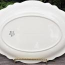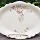 Vintage Homer Laughlin "Fluffy Rose #1" decaled platter with platinum trim. VR128, Virginia Rose shape, date code for 1955. Measures 13.5"l. No chips or cracks, light use wear. Sold as is. Inglenook Antiques...Established 1989.